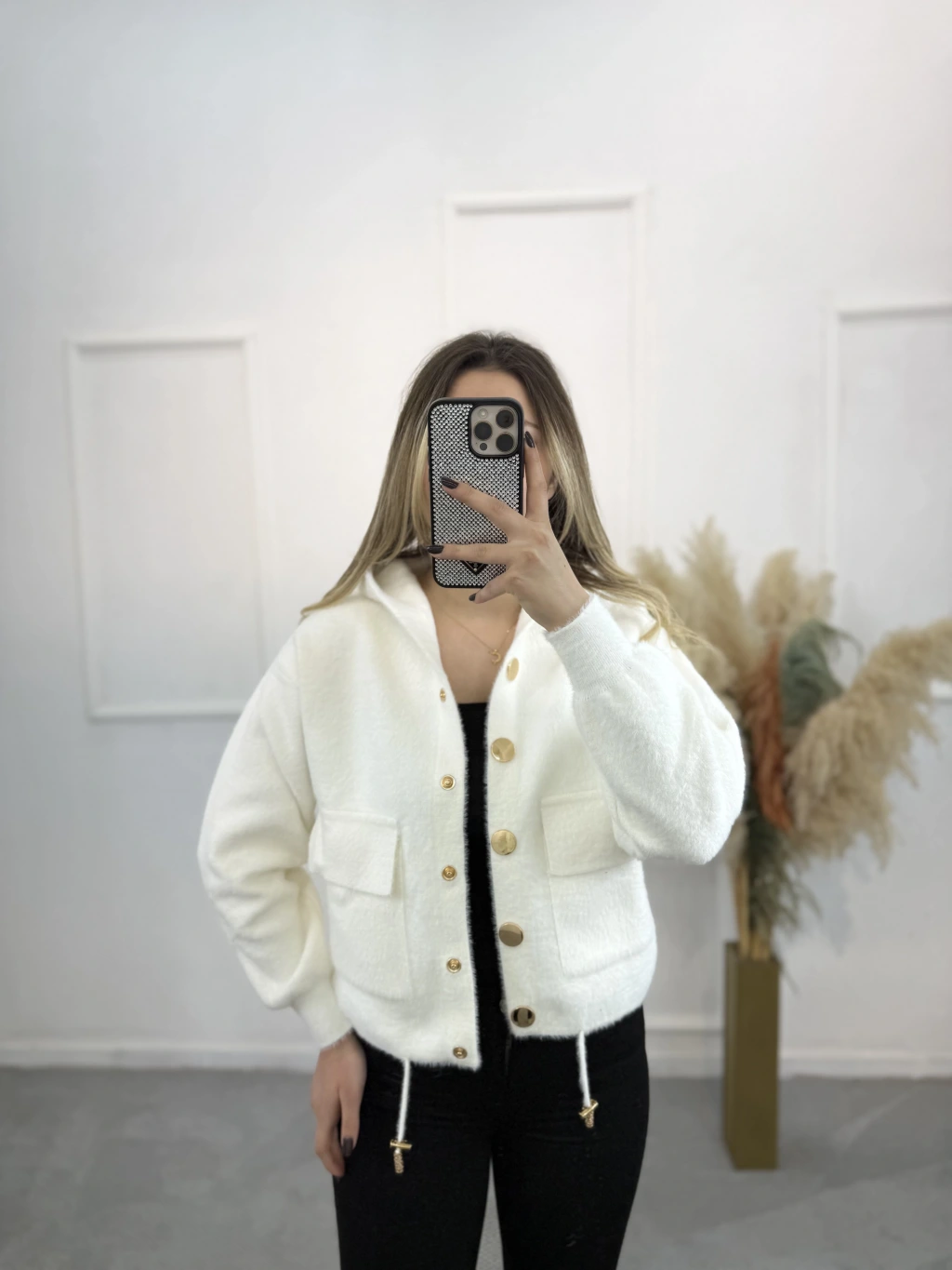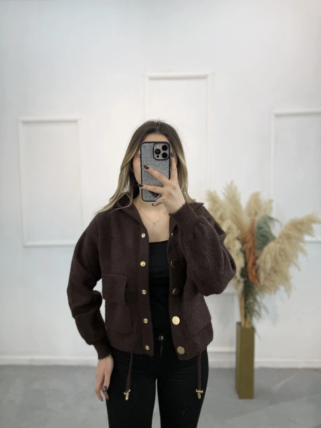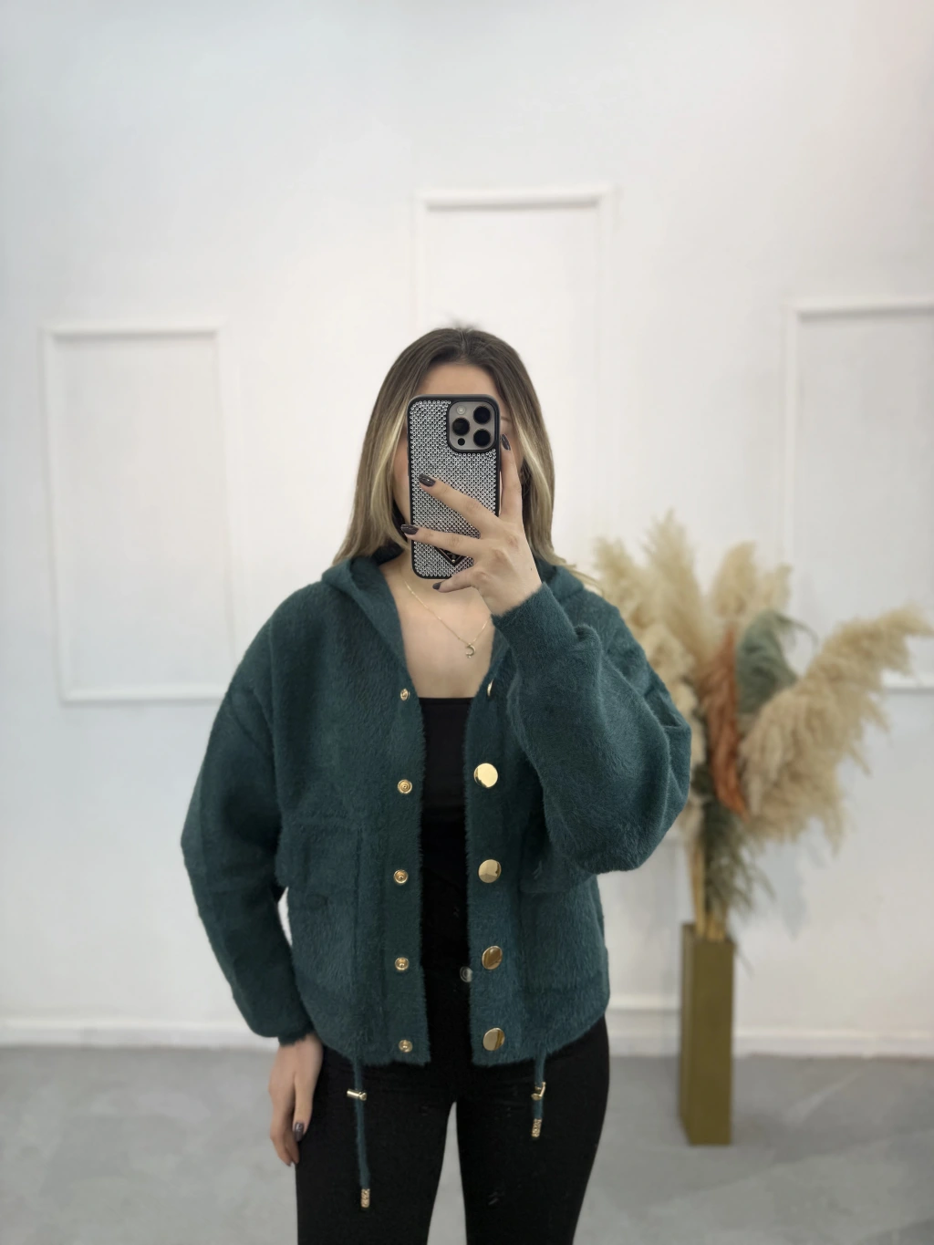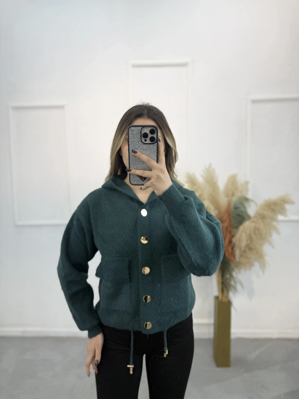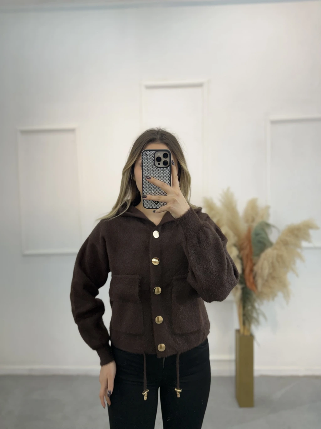 Angora Kapişonlu Düğmeli Hırka