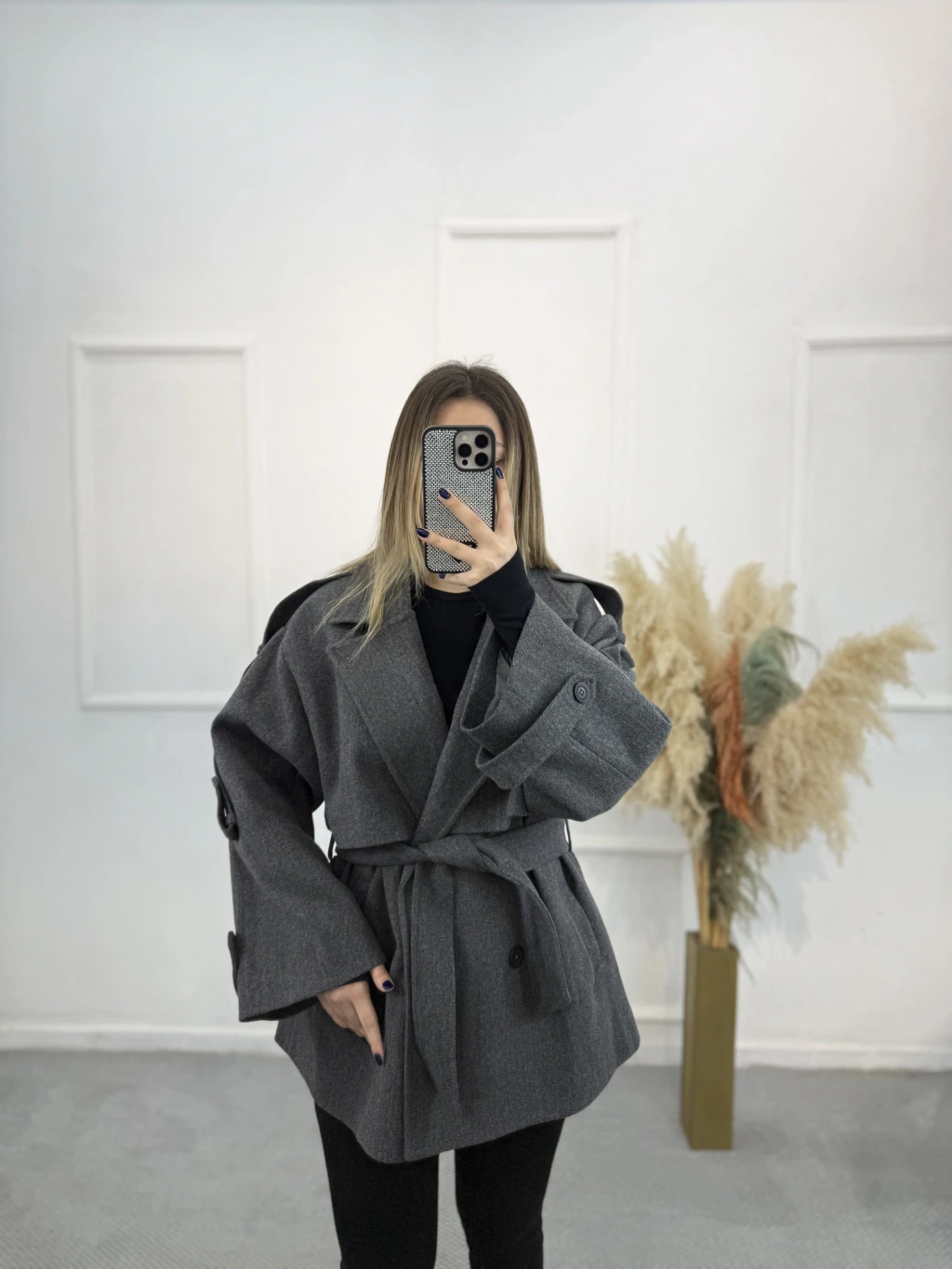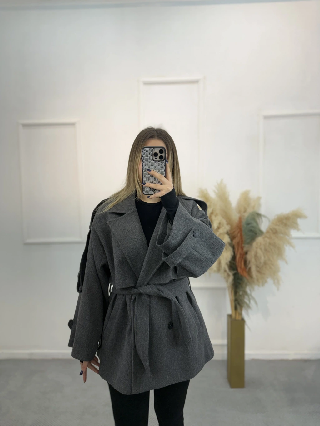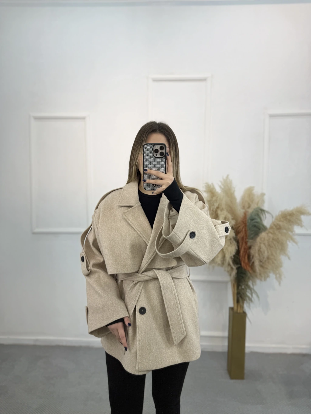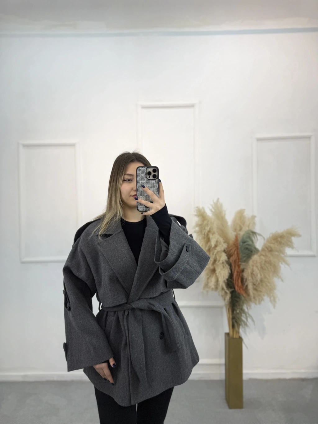Duma Sırt Detaylı Kuşaklı Kaşe Kaban