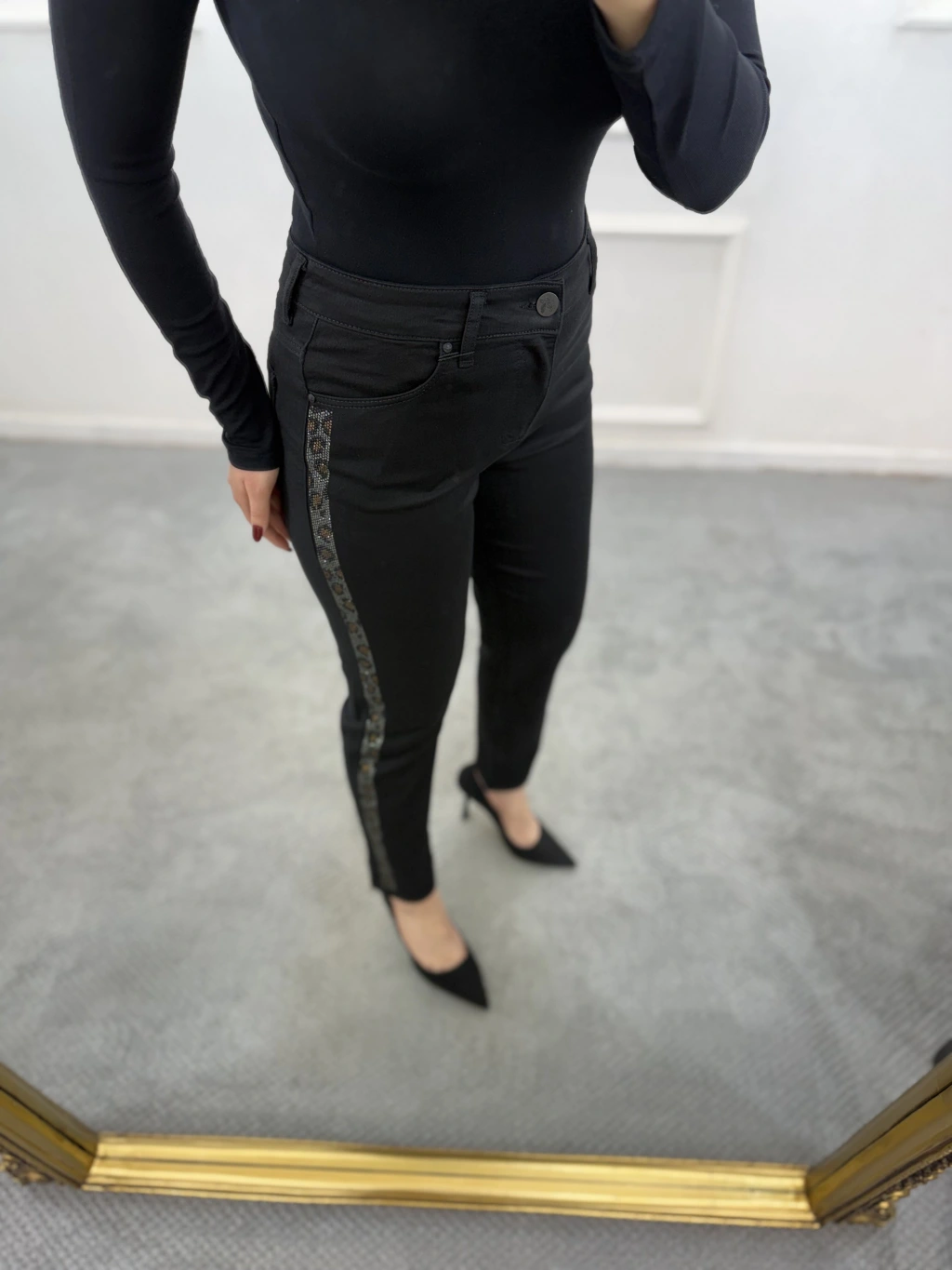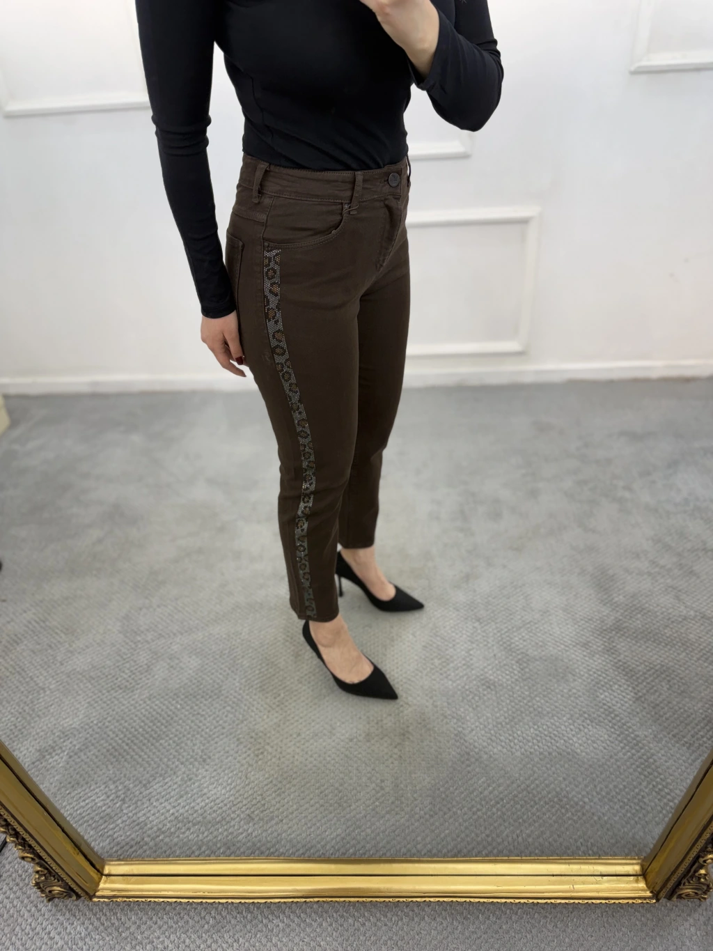 Profit Likralı Yan Leopar Taşlı Mom Jean