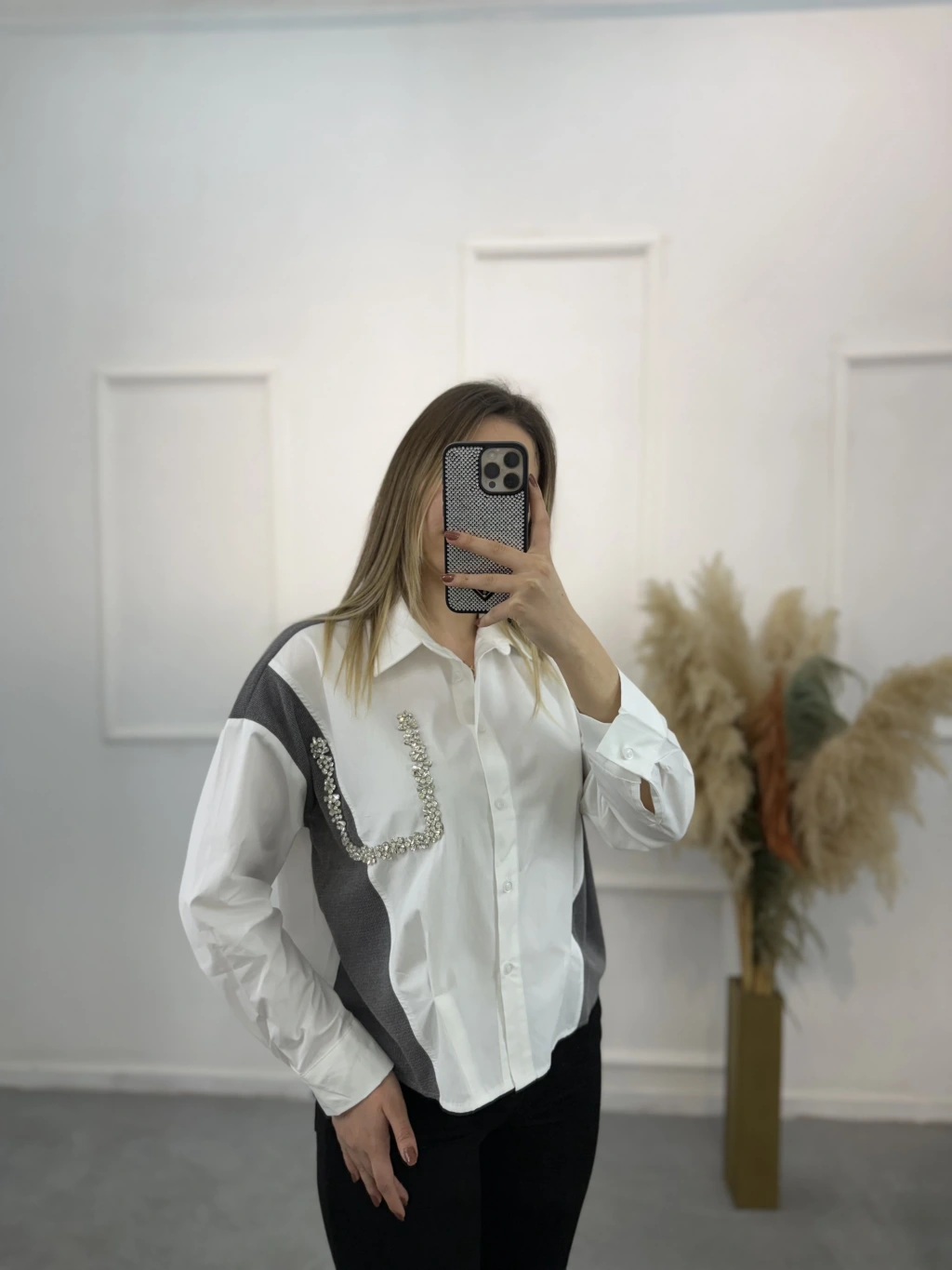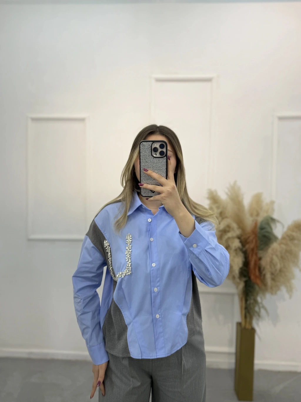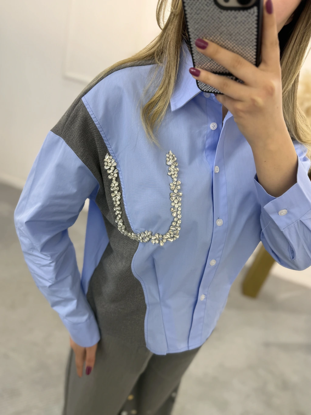 Triko Poplin Taş Detaylı Gömlek